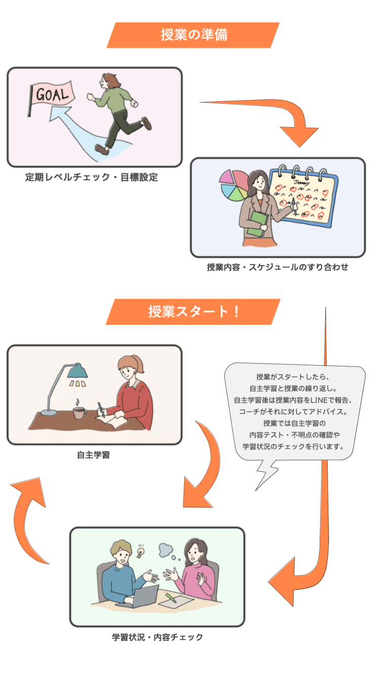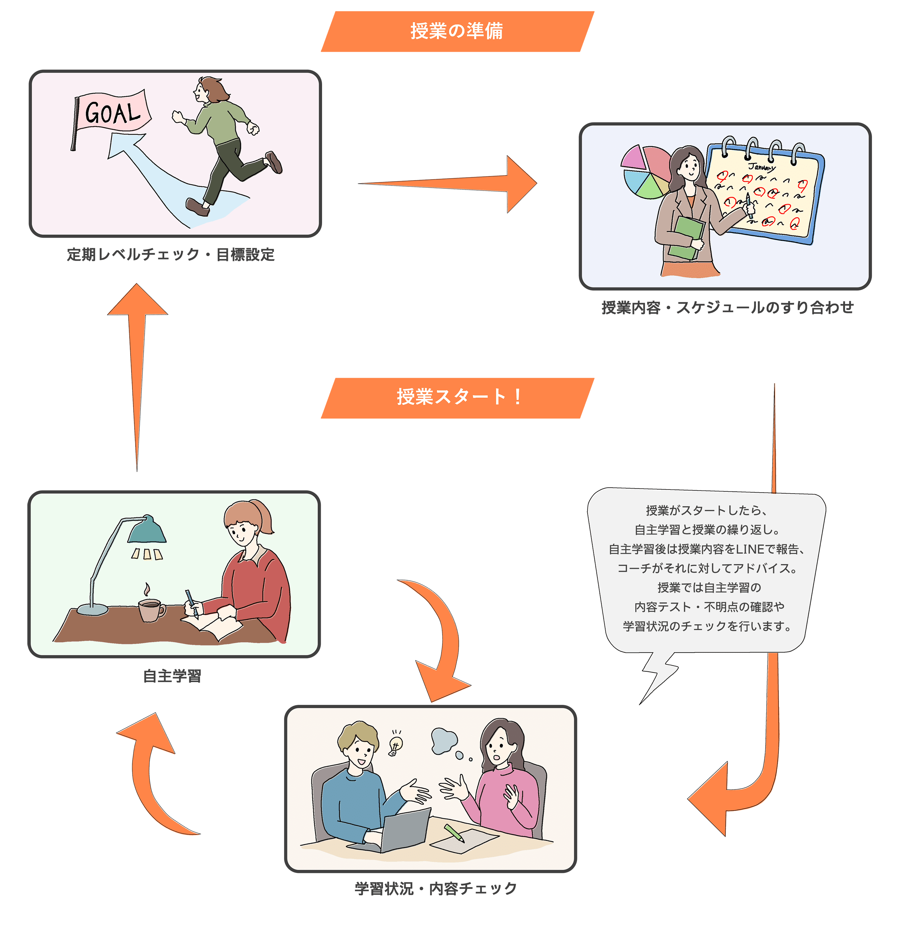 まずは英語のレベルチェックから目標を設定し、どのようなプランで授業を進めていくのかを話し合います。 英語学習の環境を作れていないときも、どう改善していけばよいか、コーチが一緒に考えます。